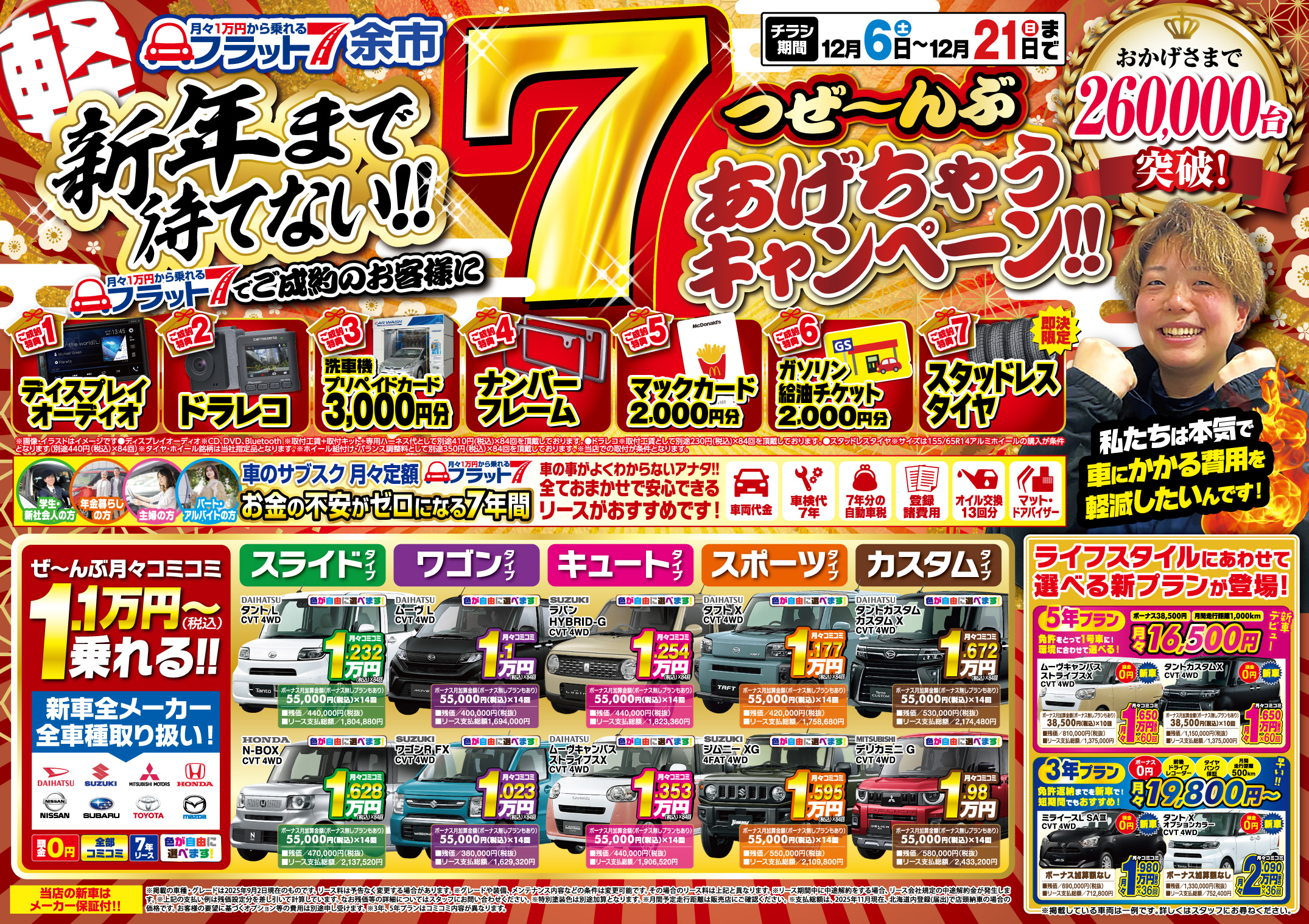 お陰様で、フラット7ご利用者は100,000人を突破!入庫車のご紹介やお客様の声などをご紹介。